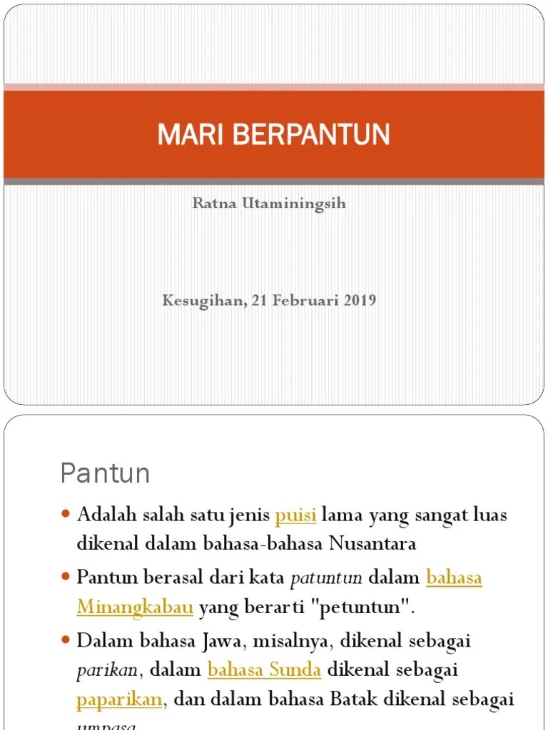 Pengertian pantun adalah merupakan salah satu jenis puisi lama yang. Pantun sendiri secara harfiah berasal dari bahasa minangkabau patuntun yang berarti penuntun. Kata pantun berasal dari kata patuntun yang diambil dari bahasa. Perubahan bunyi patuntun menjadi pantun adalah hal yang lazim dalam bahasa minangkabau. Pantun berasal dari kata patuntun dalam bahasa minangkabau yang berarti .